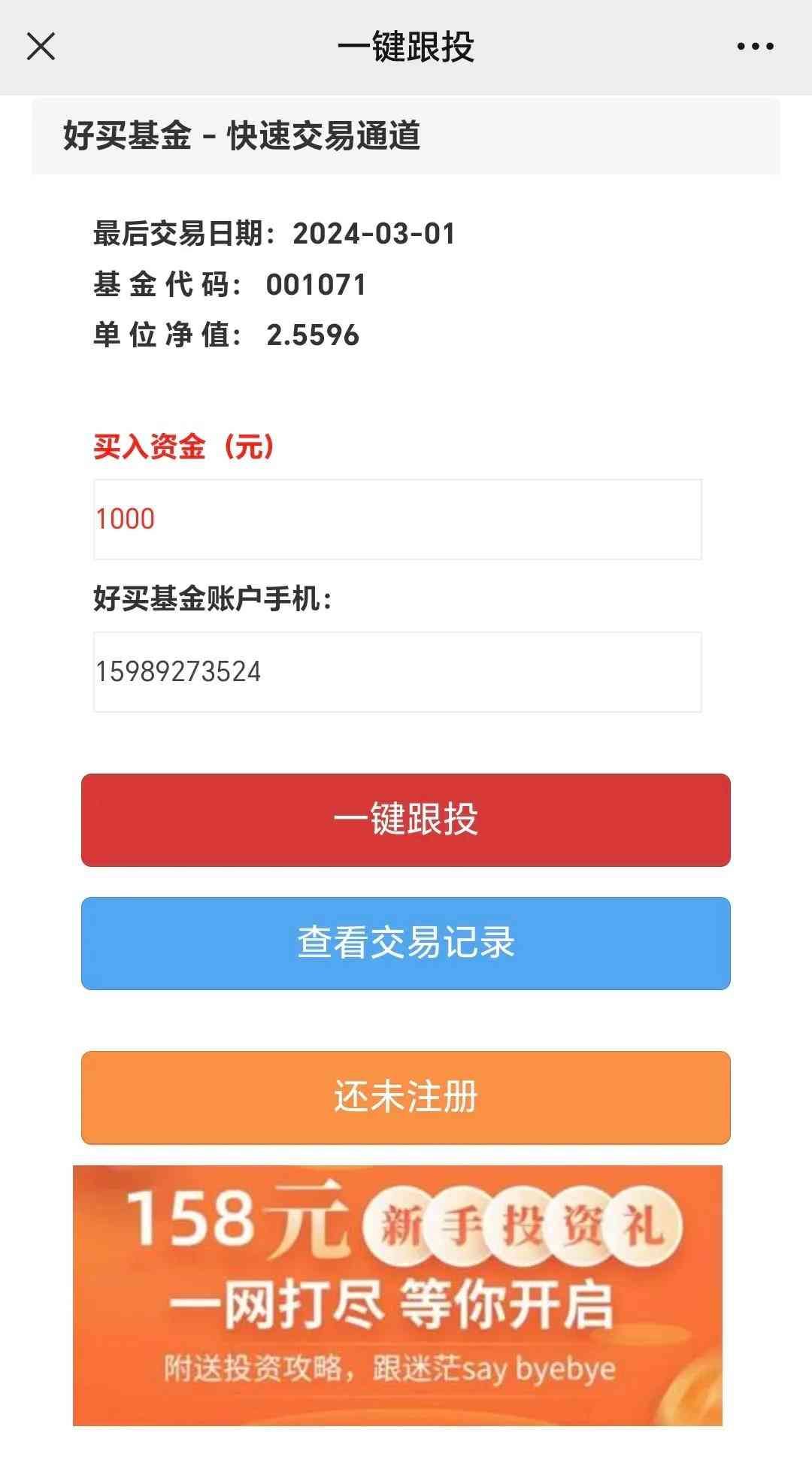 点击一键跟投,直接进入好买基金交易界面,填上买入金额、或者卖出份额,确定、输入交易密码,交易成功!