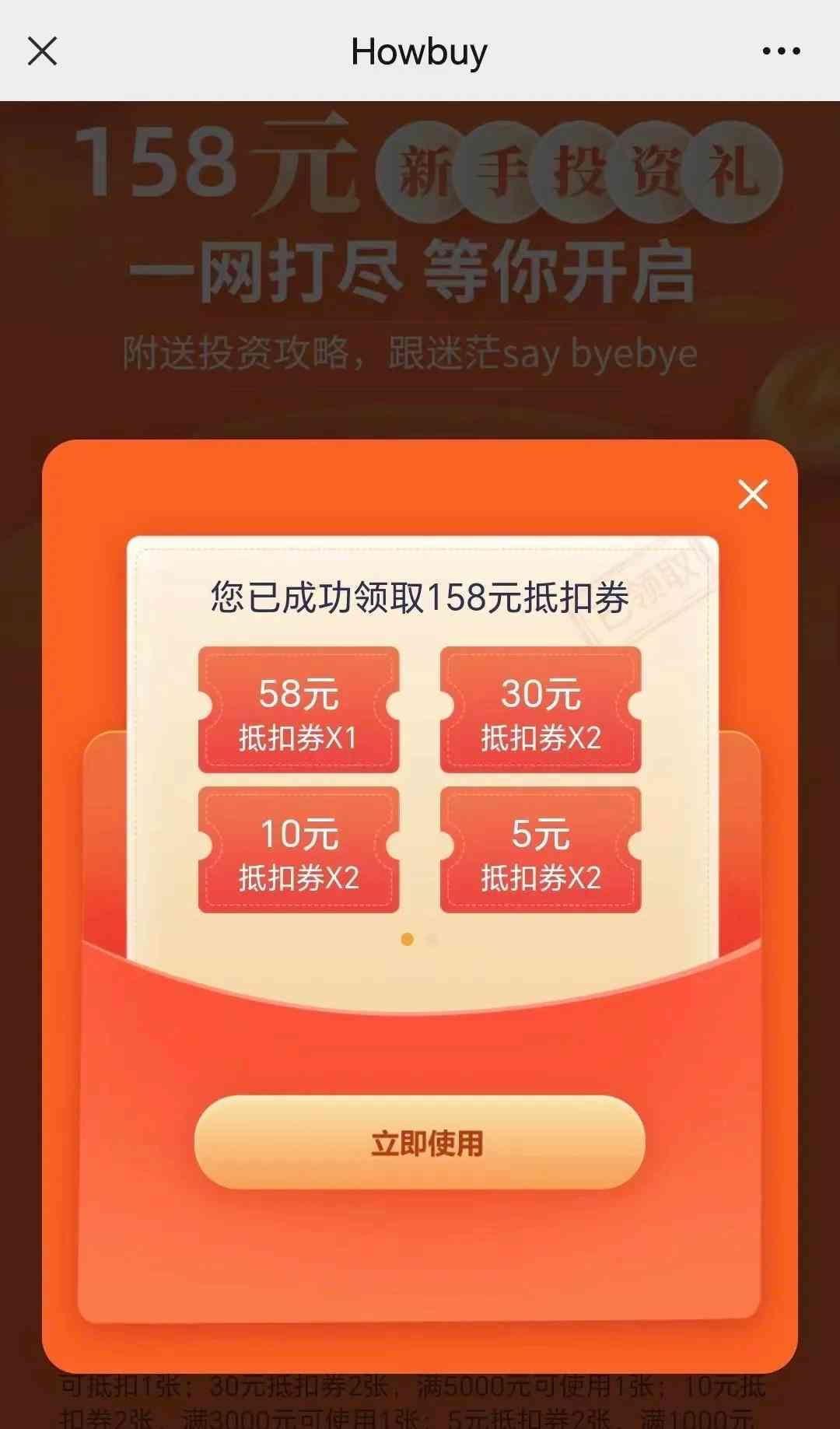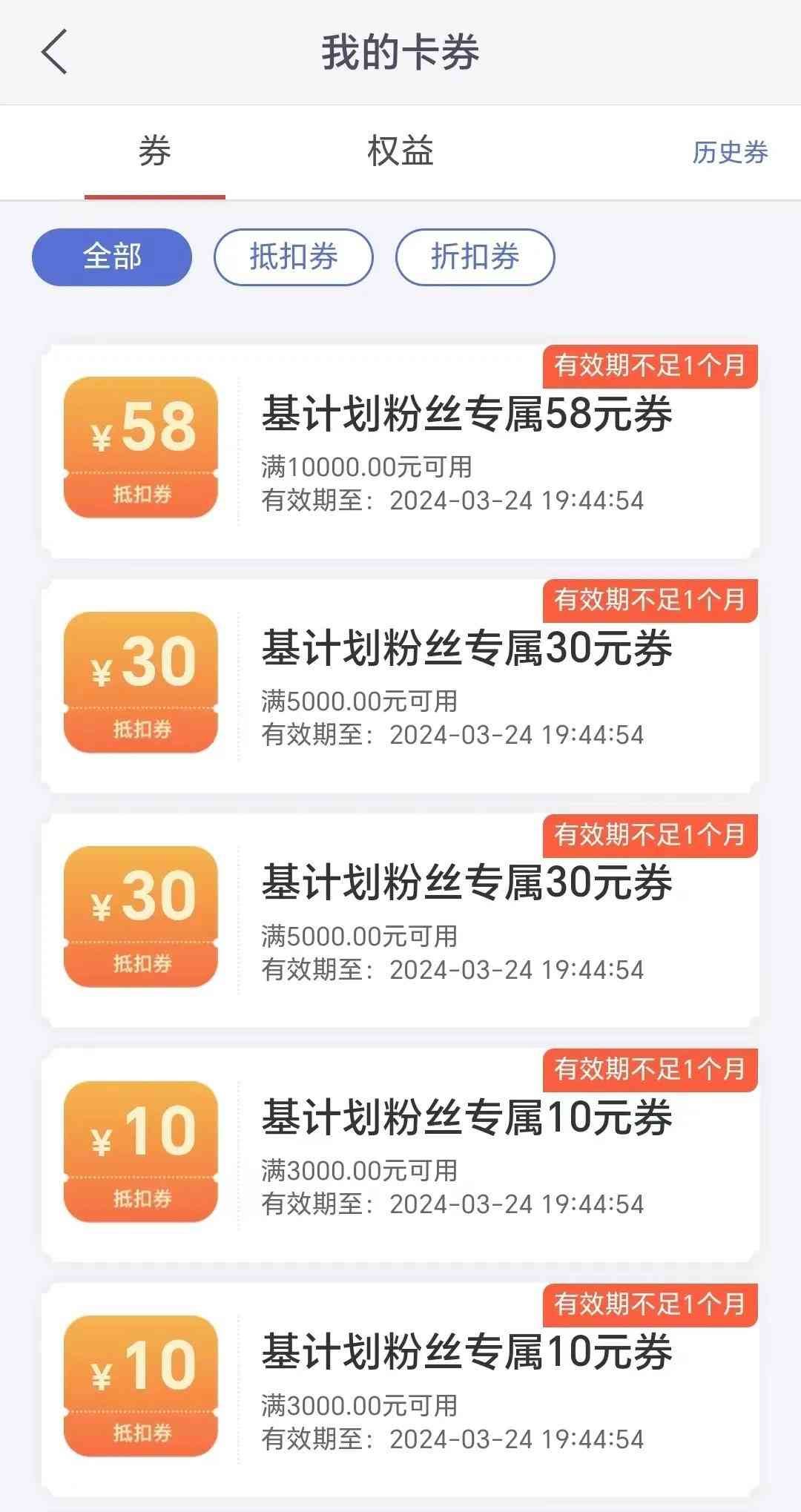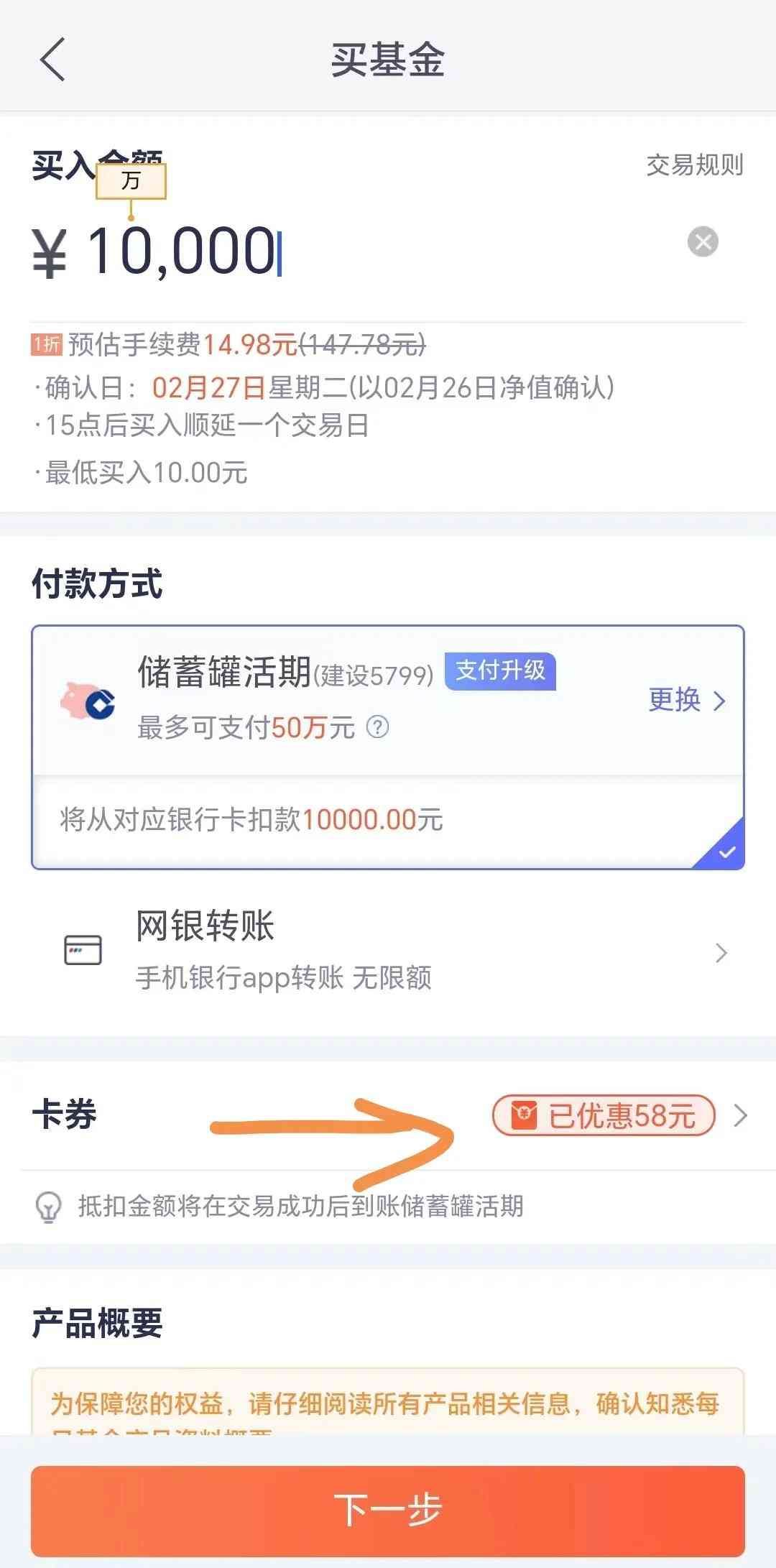 如下图,购买 1w 的基金,可以使用 58元 的券,就这么简单。