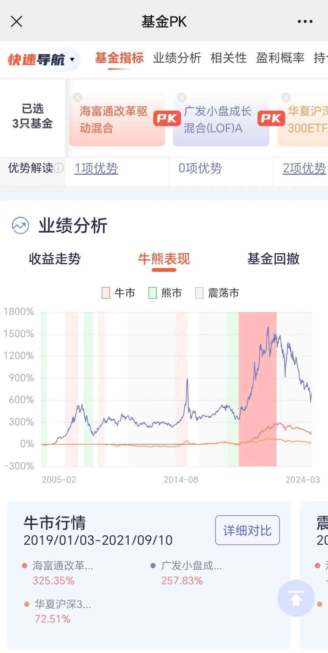 比如,选了两只主动型基金、再加一只沪深3指数基金,看它们的牛熊表现。