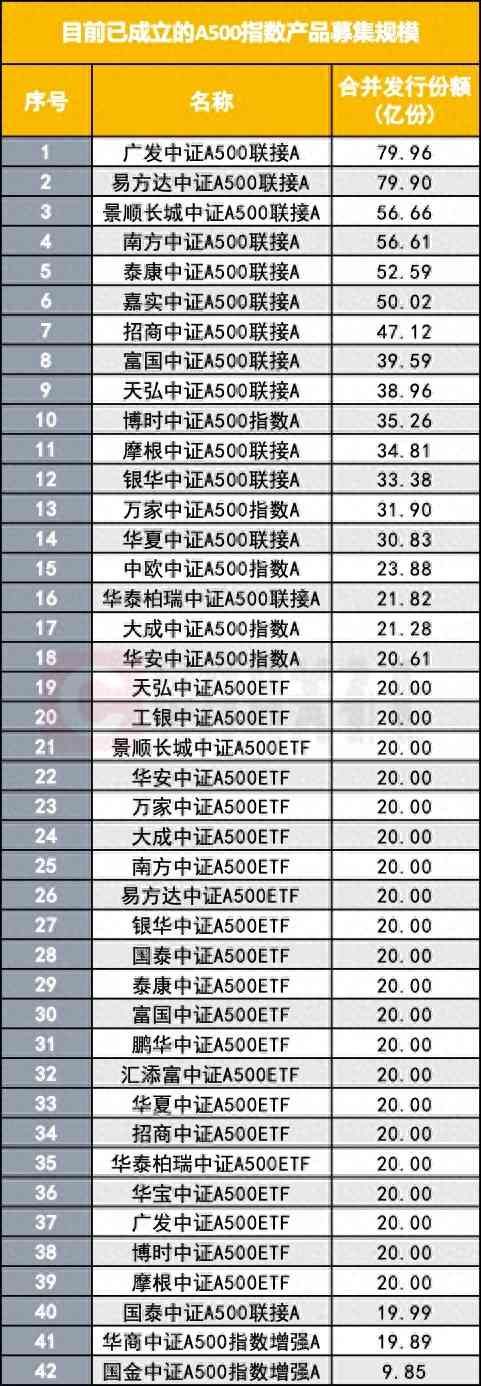 据财联社记者统计,目前已42只中证A5指数系列产品成立,合计募集规模达到1224.02亿份。在这之中,有超过半数的产品因超过募集上限而需采取比例确认。另外还有华商、国金基金成立了A5指数的指数增强型基金。