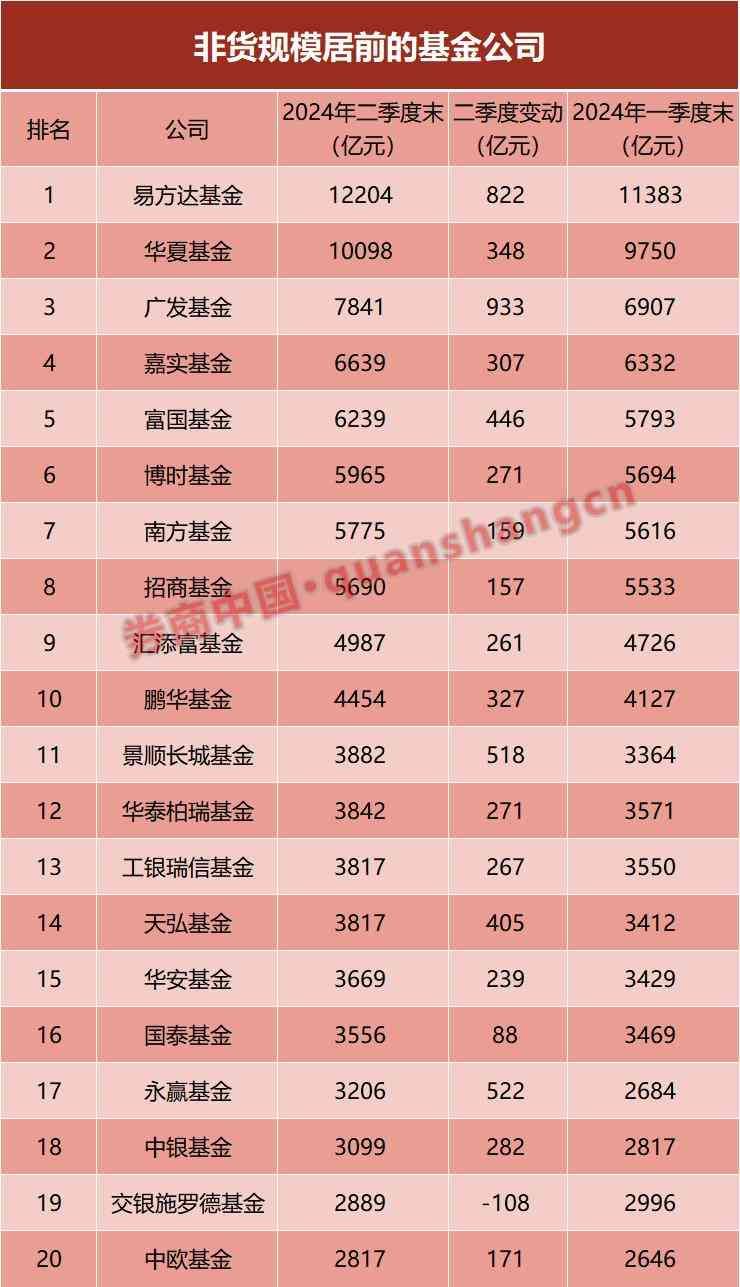 易方达基金和华夏基金是唯二非货规模超万亿元的公司,二季度末规模分别为1.22万亿元、1.01万亿元,其中华夏基金非货规模历史首次突破万亿元。