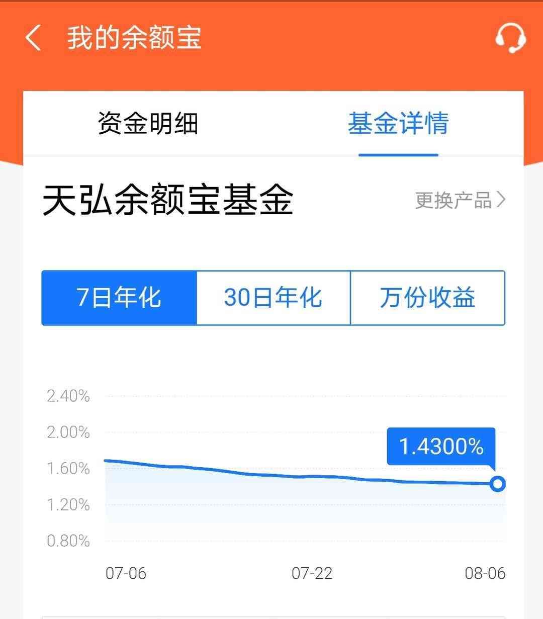 以余额宝为例,南京80后市民于女士余额宝里放着2万多元,“昨天收益0.87元,1块钱都不到!7天年化率才1.43%。”她说,页面还提示“万份收益”8月6日才0.39元。她关注的另一个放零钱的招商银行货币基金“朝朝盈”,7日年化收率也跌到了1.46%。