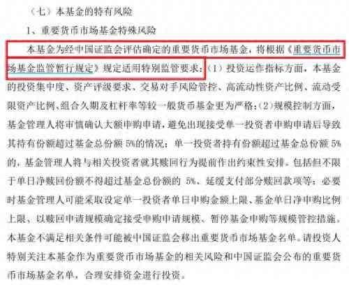 相比此前的招募说明书,此次更新后的招募说明书特别强调,本基金为经证监会评估确定的重要货币市场基金,将根据《重要货币市场基金监管暂行规定》规定适用特别监管要求:
