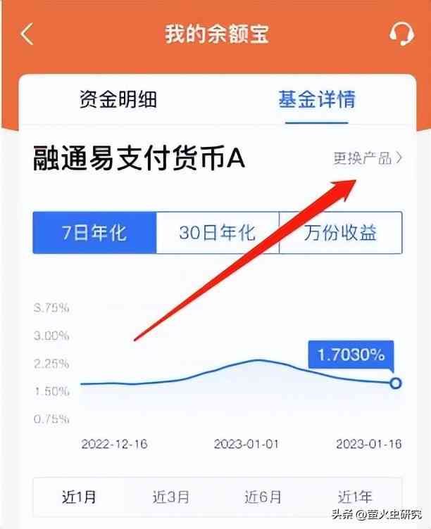 第二步、如果你嫌弃自己的收益低,可以点击当前基金的名称进入详情页,也就是点击:【融通易支付货币A,七日年化1.7030%】这一行字,就会进入当前的详情页,大家看大到右上角的【更换产品】了吧!