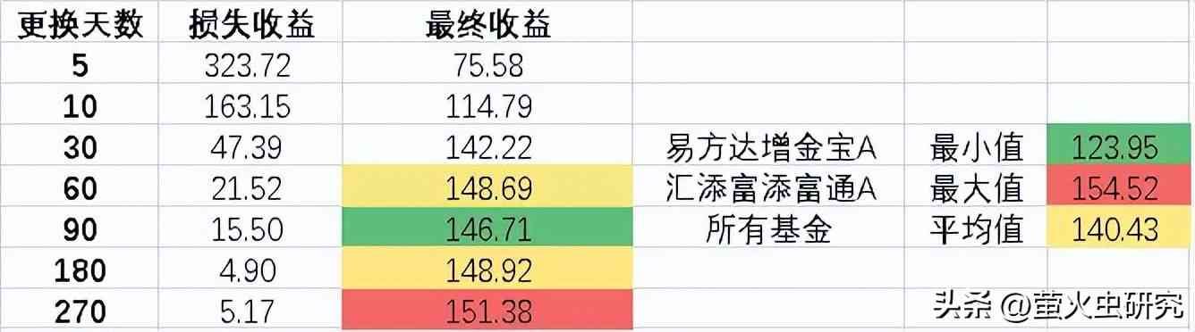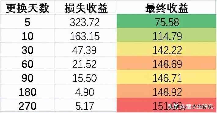 从表格中的数据能够发现,我们我们5天就换一次,会损失收益323元,10天换一次,会损失收益163元。这告诉我们不要瞎换!得不偿失。
