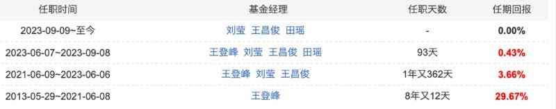 天天基金网显示,王登峰自2013年5月29日起管理天弘余额宝,是该基金的第一任基金经理,这期间任职回报为29.67%;而自2021年6月9日起,天弘余额宝便由王登峰、刘莹、王昌俊三人共同管理,任期回报为3.66%;在2023年6月7日至2023年9月8日期间,上述基金产品又新增一位基金经理田瑶,任期回报为0.43%。