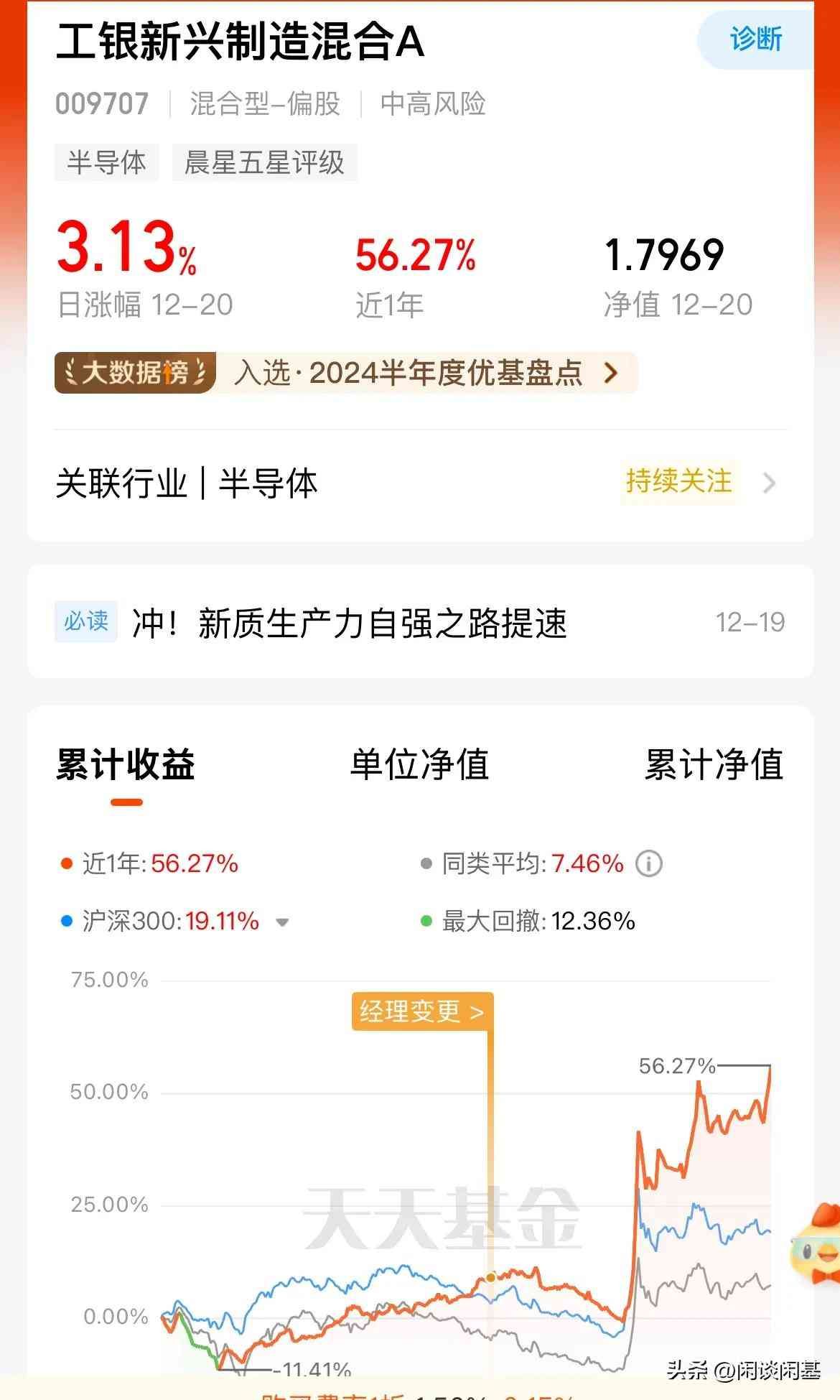 第三是工银新兴制造混合A今年以来累计涨幅54.29%,
