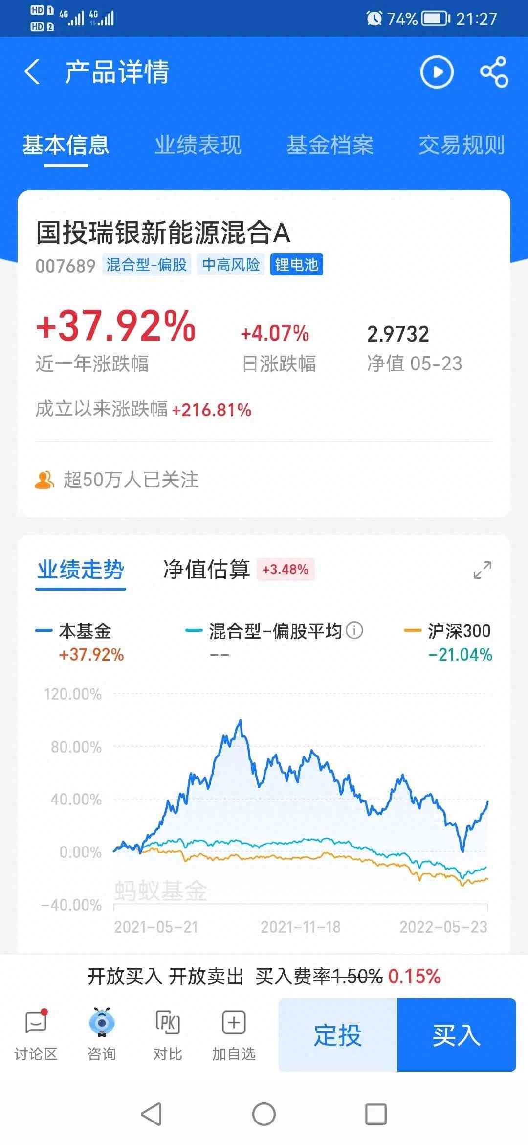 “国投瑞银”是基金的公司名称,“新能源”是基金的投资方向或者说是基金特点,“混合”是基金类型,混合型基金,字母“A”是基金买入和卖出的收费方式,一般A类基金适合长期持有,收费方式比较划算。再看下一幅图: