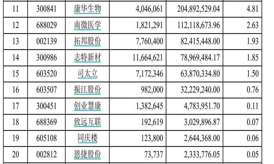 该基金的隐形重仓股为康华生物、南微医学、拓邦股份、志特新材、司太立、振江股份、创业慧康、致远互联、同庆楼、恩捷股份。