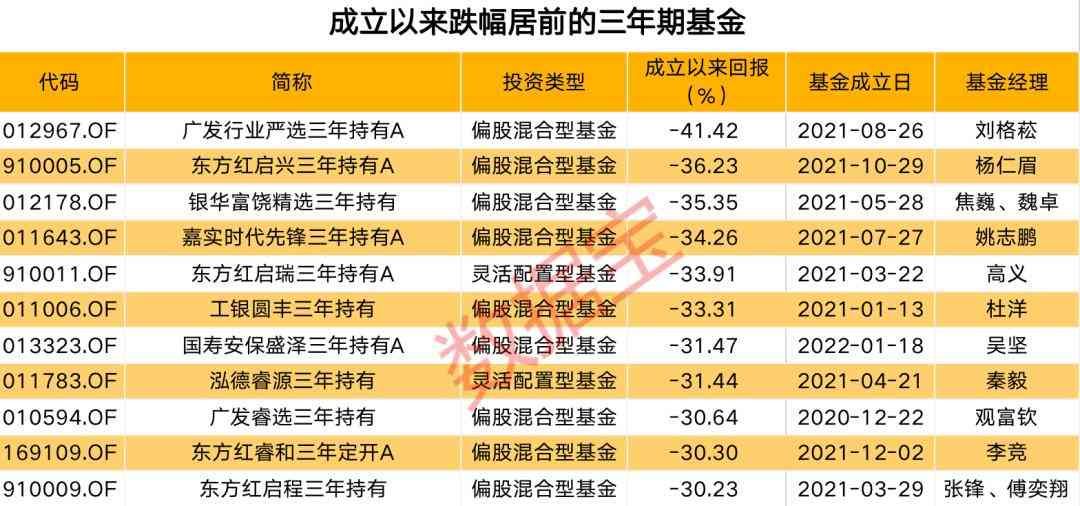 成立以来净值跌幅超30%的还有东方红启兴三年持有A、银华富饶精选三年持有、嘉实时代先锋三年持有A等基金。