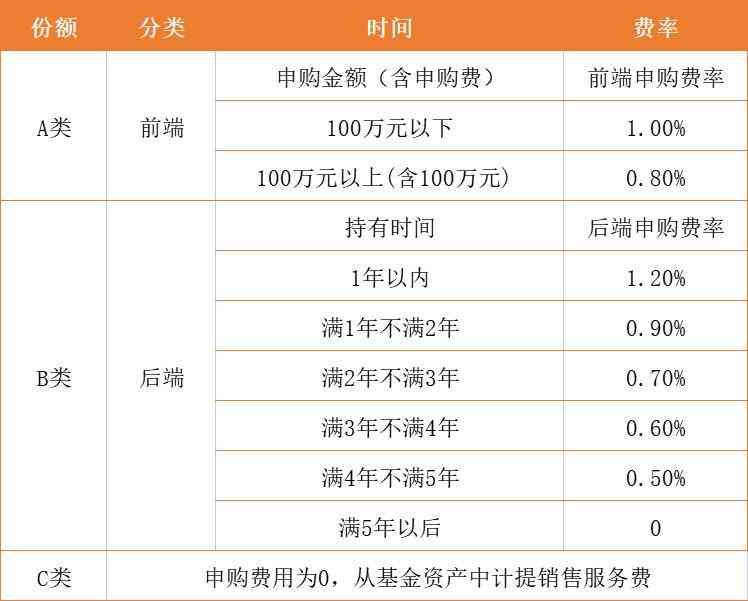第二,B类,通常指后端收费。就是说,在买基金时不收认购费/申购费,等到赎回时再一并收取。一般这个费用,由持有基金的时间长短来决定。投资时间越长,收取费用越少。