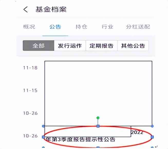 3.点击“公告”,找到基金最新一个季度的季度报告。如下图: