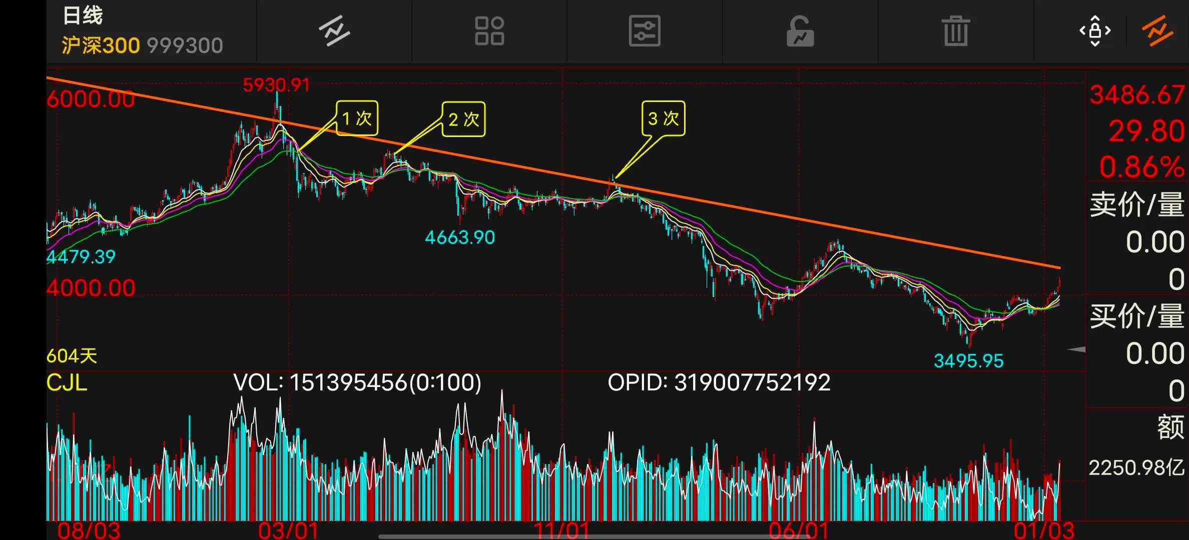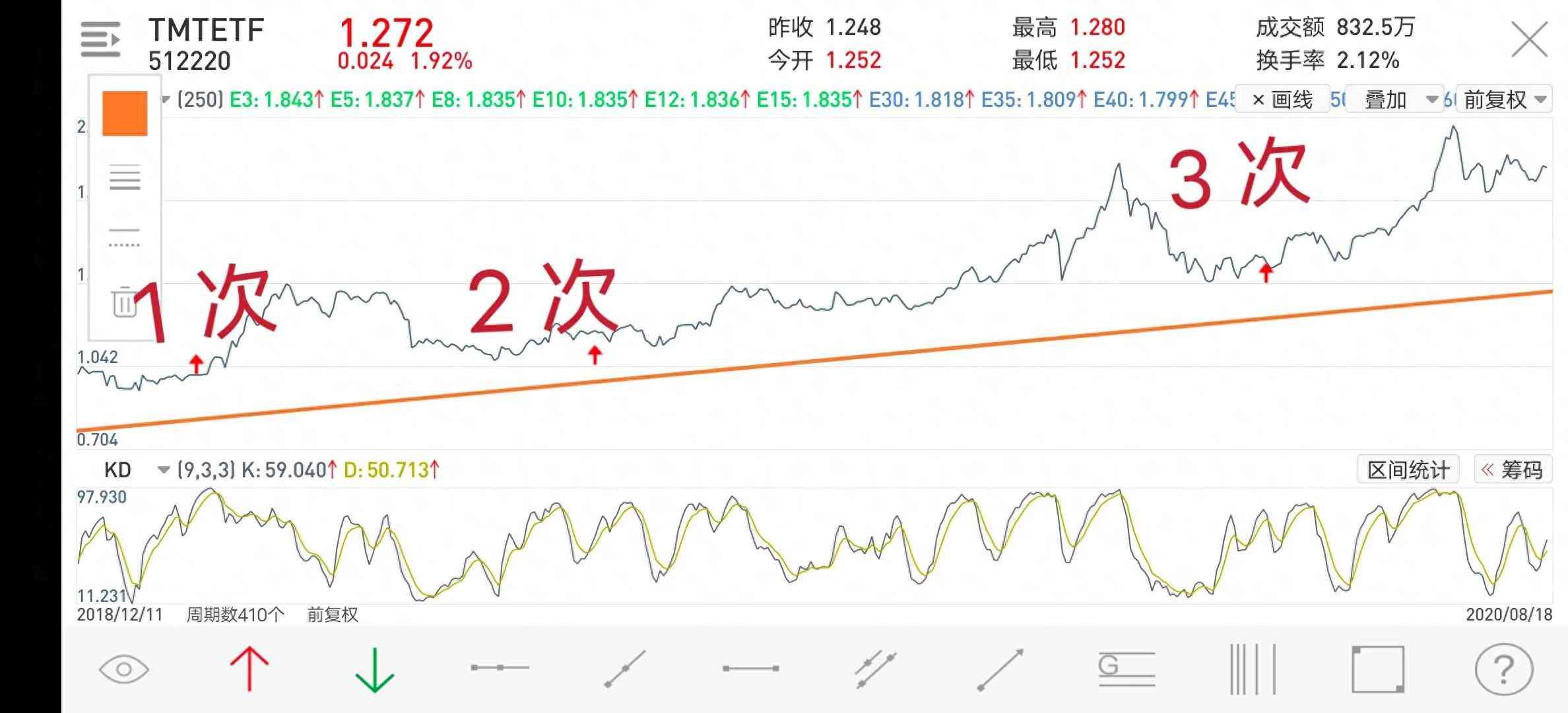 第三次加仓:同上 ,再次打到趋势线上,KDJ 底部金叉,如图 (3 次),加仓 20% 止损 5%!