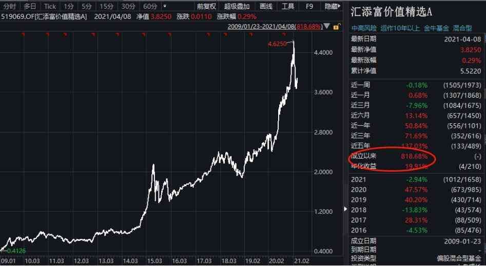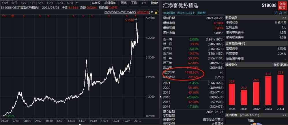 25年8月25日,汇添富优势精选混合基金成立,到现在成立以来的回报率达1887.1%(同期业绩比较基准340.68%)(数据基金2020年年报)。
