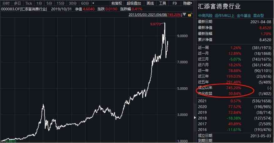 2013年5月3日成立的汇添富消费行业混合,成立近8年以来的累计收益是745%,年化收益高达30%。不过,成立之初认购的5151人,到去年底只有317人还有持仓,只有79人没有赎回过。