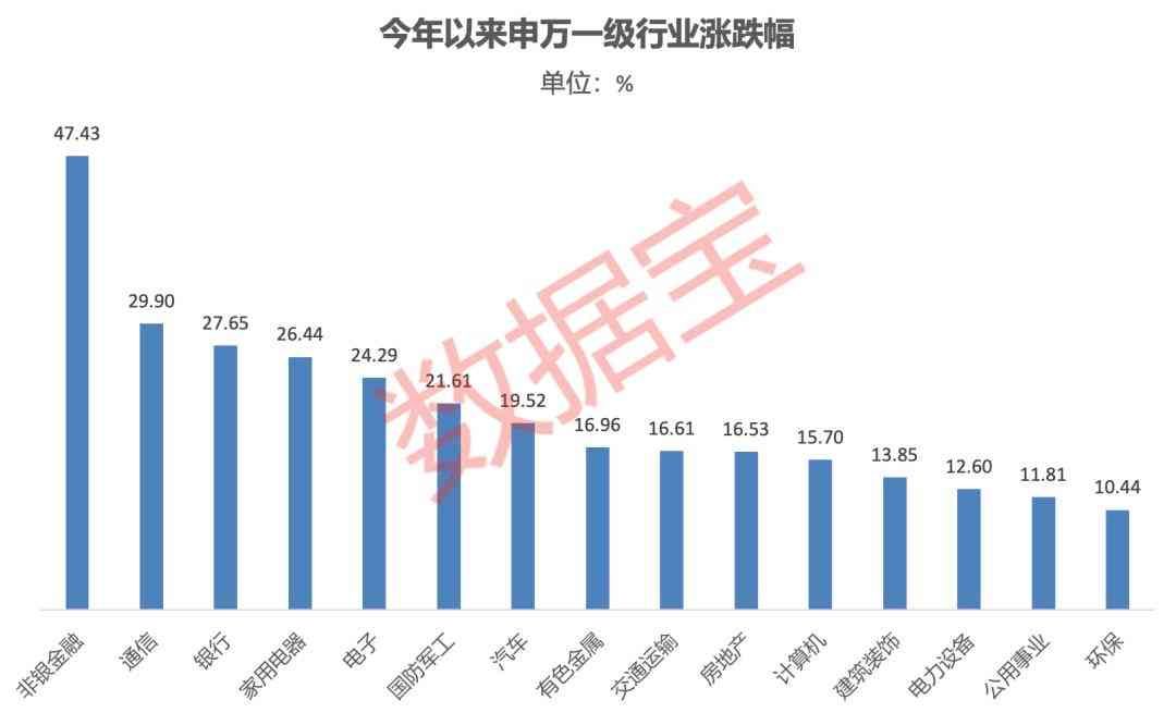 今年以来,金融和科技股行情表现格外亮眼,申万一级行业中,非银金融大涨47.43%,涨幅居首;通信、银行、电子、计算机等行业指数紧随其后,均涨超15%。特别是9月下旬以来,以数字金融、光通信、芯片半导体等为首的科技板块,成为市场反弹“急先锋”,其间收益率大幅优于其他行业板块。