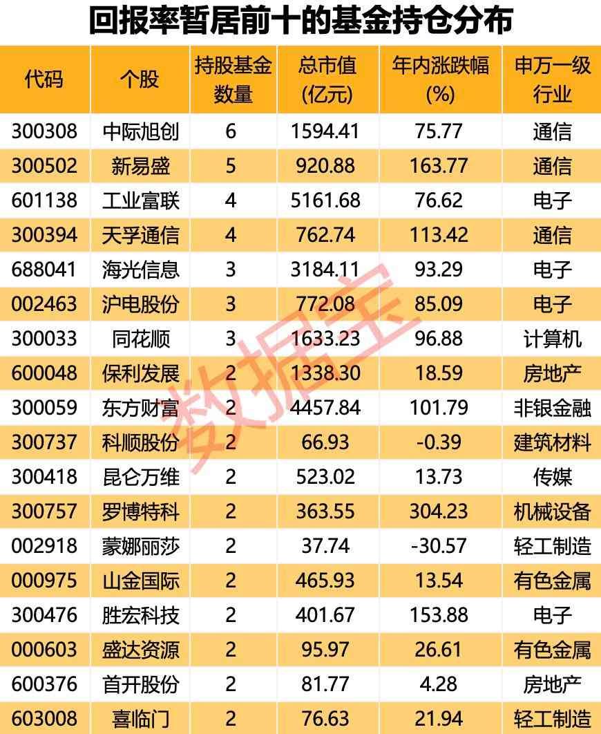 5只基金持股新易盛,4只基金持股工业富联和天孚通信,海光信息、沪电股份、同花顺则同时获得3只基金共同持有。