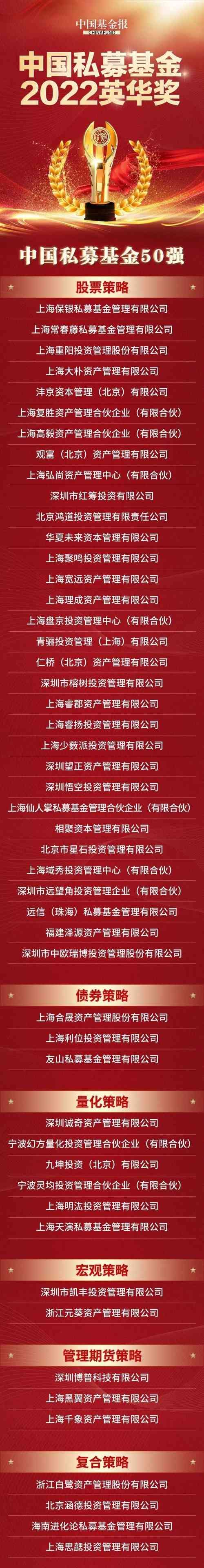 由中国基金报主办的2022中国私募基金 英华奖评选今日隆重揭晓。六大策略的50家私募基金公司获评中国私募基金50强。