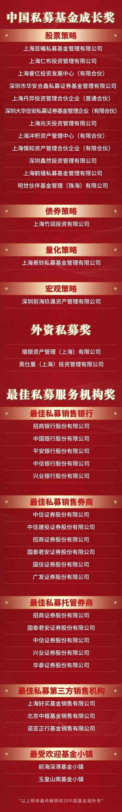 中国私募基金的发展,得到了各类服务机构的大力支持。此次中国基金报还评选出最佳私募服务机构奖项,多家银行、券商、第三方销售以及基金小镇等机构获评。
