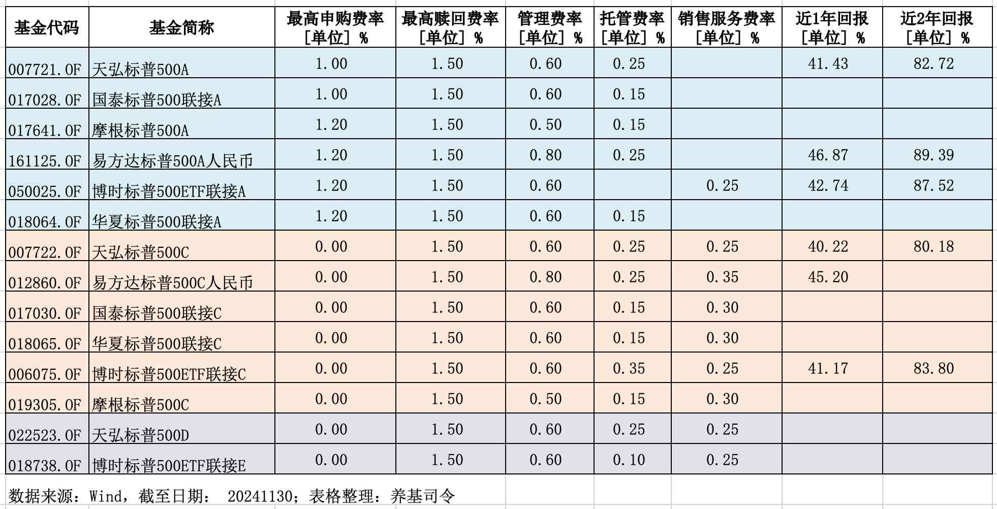 从综合费率来看,A类份额最高的多了0.4%,C类份额最高的多了0.3%,天弘标普5D的费率并不比C类更占优势。