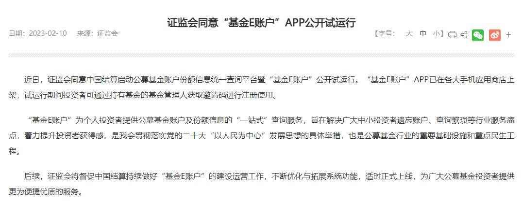2月10日,记者注意到,证监会发布了同意“基金E账户”APP公开试运行的公告。公告显示,该产品能为个人投资者提供公募基金账户及份额信息的“一站式”查询服务,旨在解决广大中小投资者遗忘账户、查询繁琐等行业服务痛点,着力提升投资者获得感。