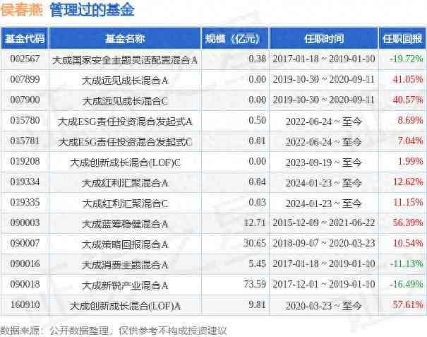 侯春燕女士:中国国籍,硕士,具有基金从业资格。2010年6月加入大成基金管理有限公司,曾担任研究部研究员、基金经理助理。2015年12月9日至2021年6月22日任大成蓝筹稳健证券投资基金基金经理。2017年1月18日至2019年1月10日任大成消费主题混合型证券投资基金、大成国家安全主题灵活配置混合型证券投资基金基金经理。2017年12月1日至2019年1月10日任大成新锐产业混合型证券投资基金基金经理。2018年9月7日至2020年3月23日任大成策略回报混合型证券投资基金基金经理。2019年10月30日至2020年9月28日任大成远见成长混合型证券投资基金基金经理。2020年3月23日起任大成创新成长混合型证券投资基金(LOF)基金经理。2022年6月24日起任大成ESG责任投资混合发起式证券投资基金基金经理。