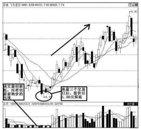 一段较长时间低位盘整后,股票缩量到低点(地量),此时投资者应加强关注,这很可能是长牛股出现的前兆。在地量后几日,该股成交量开始明显放大,同时股价收出中阳,此时投资者应考虑进场。