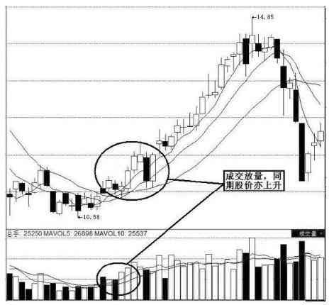 成交量可以说是股价的动量。一只股票在狂涨之前经常是长期下跌或盘整之后,这样在成交量大幅萎缩,再出现连续的放大或温和递增,而股价上扬。一只底部成交量放大的股票,就像在火箭在升空前必须要有充足的燃料一样,必须具有充分的底部动力,才能将股价推升到极高的地步。因此,一只狂涨的股票必须在底部出现大的成交量,在上涨的初期成交量必须持续递增,量价配合,主升段之后往往出现价涨量缩的所谓无量狂升的强劲走势。