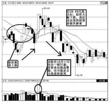 例:中兴通讯(63)(见下图)该股27年10月17日成交量拉出了一根巨量,尽管当日股价以长阳线收盘,但投资者仍需提高警惕,这可能是一次技术破位。但是技术破位需要确认两个“3”:时间上为连续放量下跌3天,空间上为下跌幅度超过3%。巨量后3天股价连续下跌,随后该股股价一路下行。