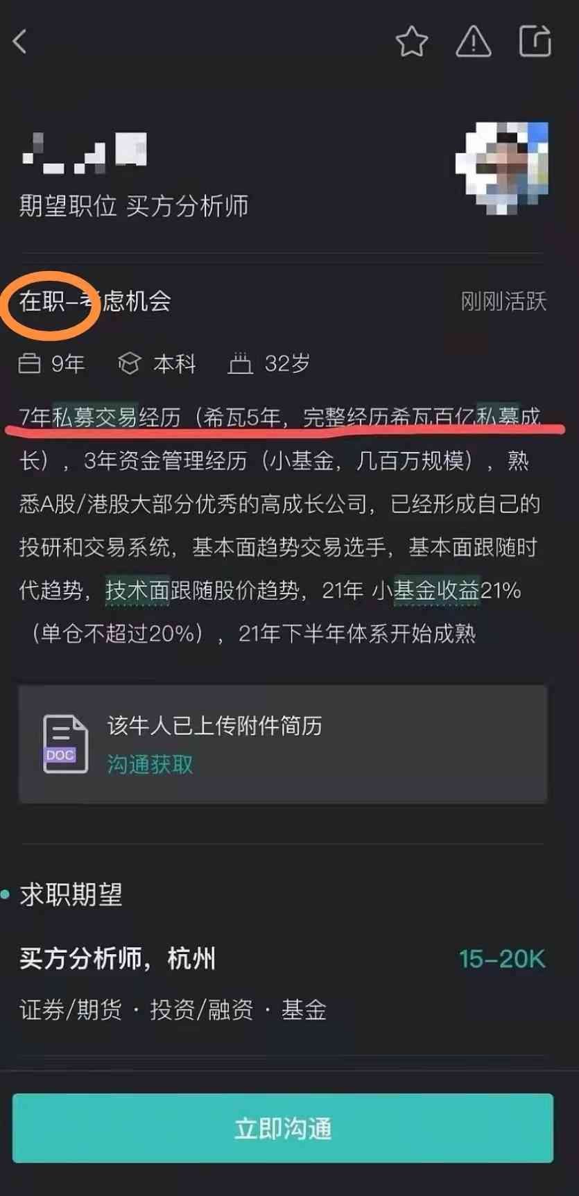 疑似希瓦基金经理网上求职买方分析师