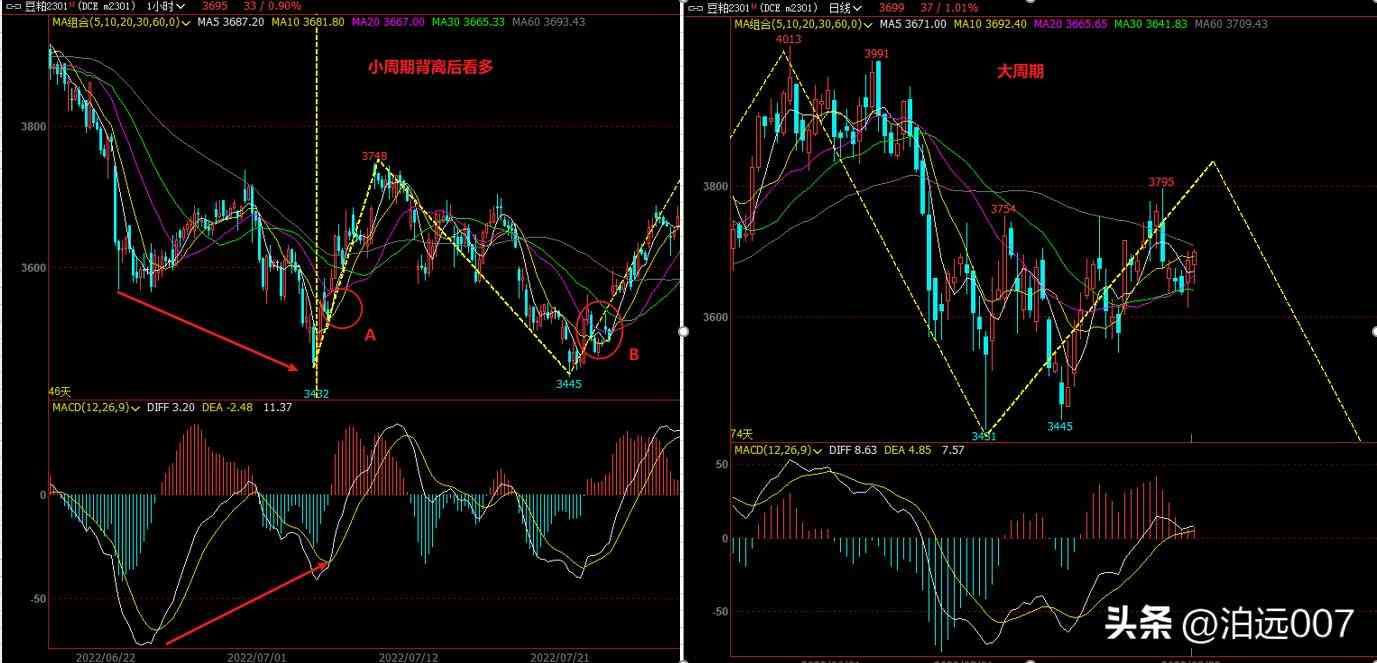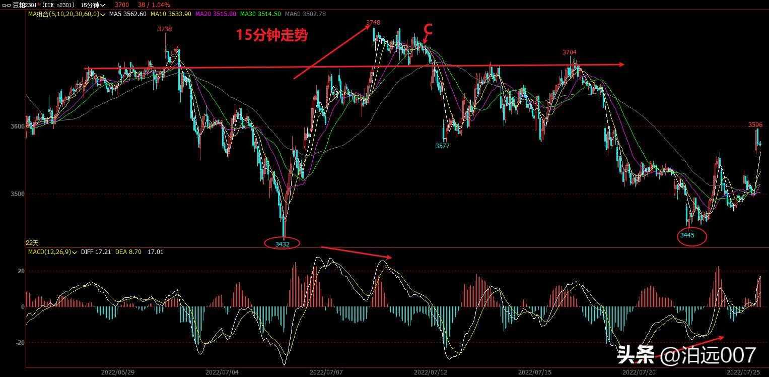 进场后需要关注操作周期的次级别15分钟的走势了,如图在出现macd顶背离后死叉就要立马止盈。最晚在图中C点位置(大阴线跌破3个均线)就要止 盈。如果我们切换到15分钟内部即5分钟图看C点的位置就是5分钟3748背离后出现的不创新高,即2个空头信号出现的位置,所以是最晚的离场点。注意15分钟图3345点位置出现了macd底背离,这个刚好有和60分钟线的B点不创新低共振!是B点多头信号进一步增强。综合来看60分钟的B点不但有 底背离、反转形态还有次级别的底背离共振!天时地利人和,是风险最低的位置。