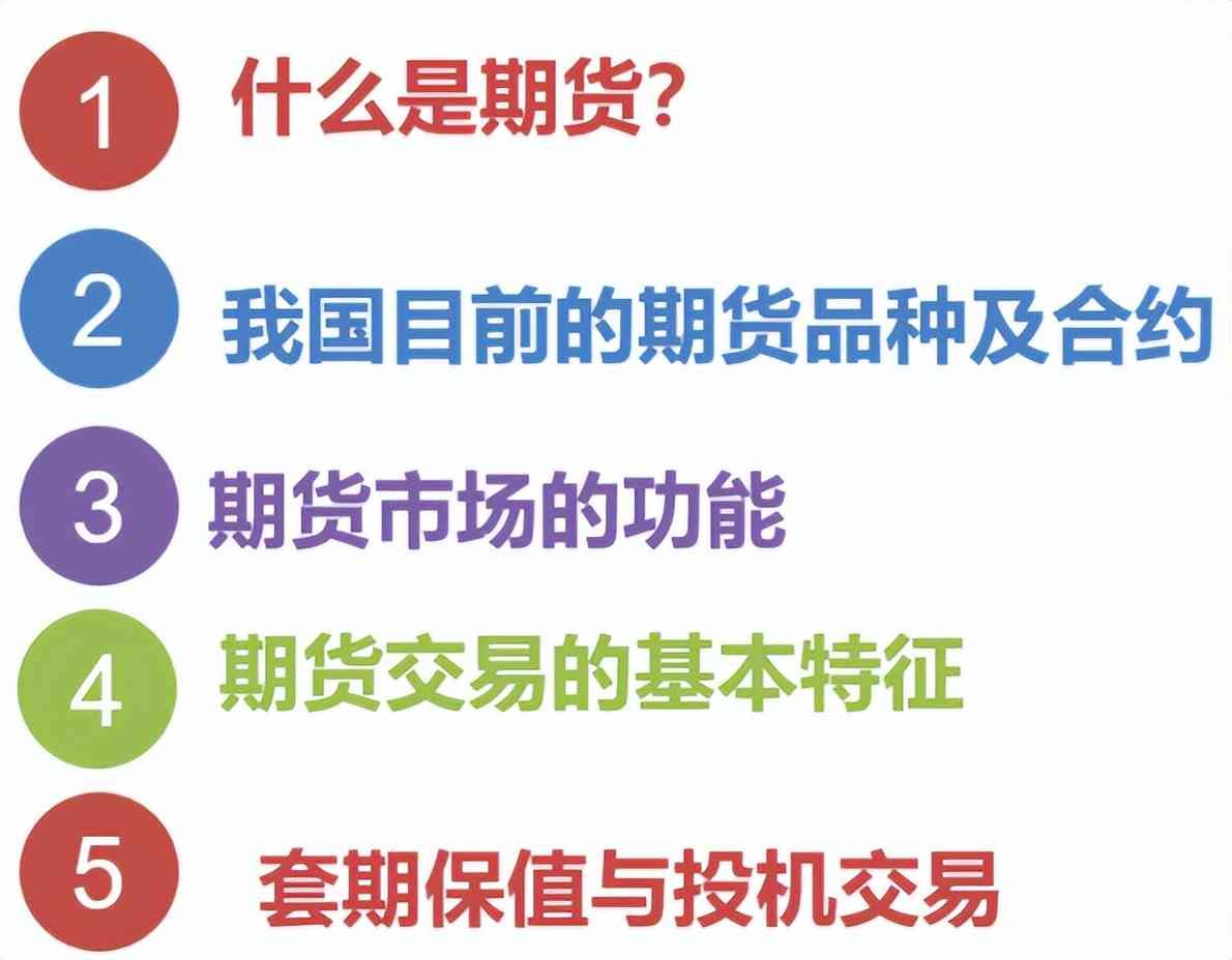 由上图所示,我会按照五个部分来展开,什么是期货;我国目前的期货品种有哪些;期货市场的功能;期货交易的特征与套期保值与投机。
