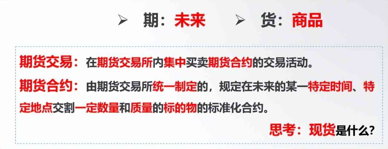 期:就是未来的意思,比如期房;货:就是商品或者合约等。所以期货的含义就是未来的商品或者合约。期货交易,就是交易未来的商品或者合约。
