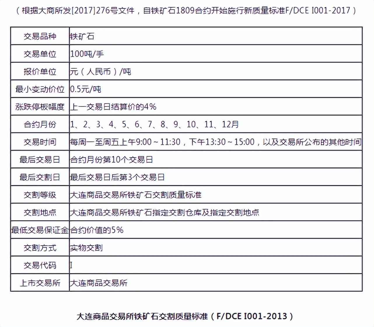 由上图我们可以看到铁矿石合约的交易单位和最小变动单位,所以能够得出,铁矿石1手的最小变动价格是50元。也可以知道铁矿石的涨跌幅度、合约月数、交易时间等要素。对于供货商,是可以查到交割产品的规格、等级与地点。