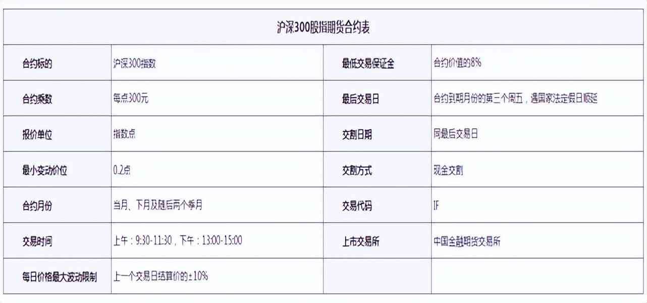 最低保证金是8%,它的最大杠杆就是1/8=12.5倍。交易合约月份、时间、最后交易日在图表中都有,但是它的交割方式是现金,就是说你无论平仓还是持有到期,得到的都是现金,不会是指数成分股。