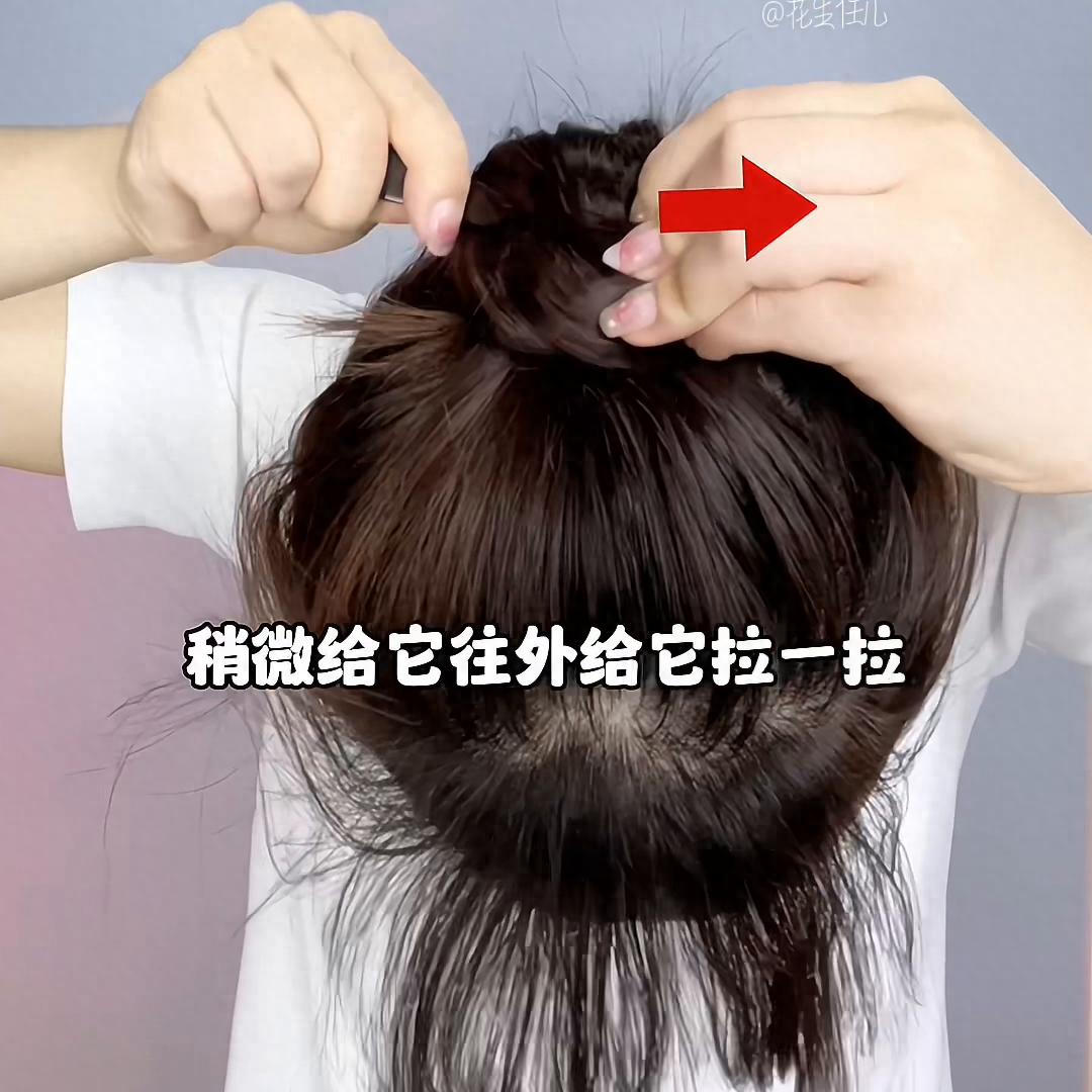 发簪挽出横穿的这个过程,另一只手不是捏着丸子的另一边吗?稍微给它往外给它拉一拉,方便发簪穿出来。后脑勺的头发再拉蓬松一点,1款就完成了。它真的非常结实,比较适合发量少的姐妹。