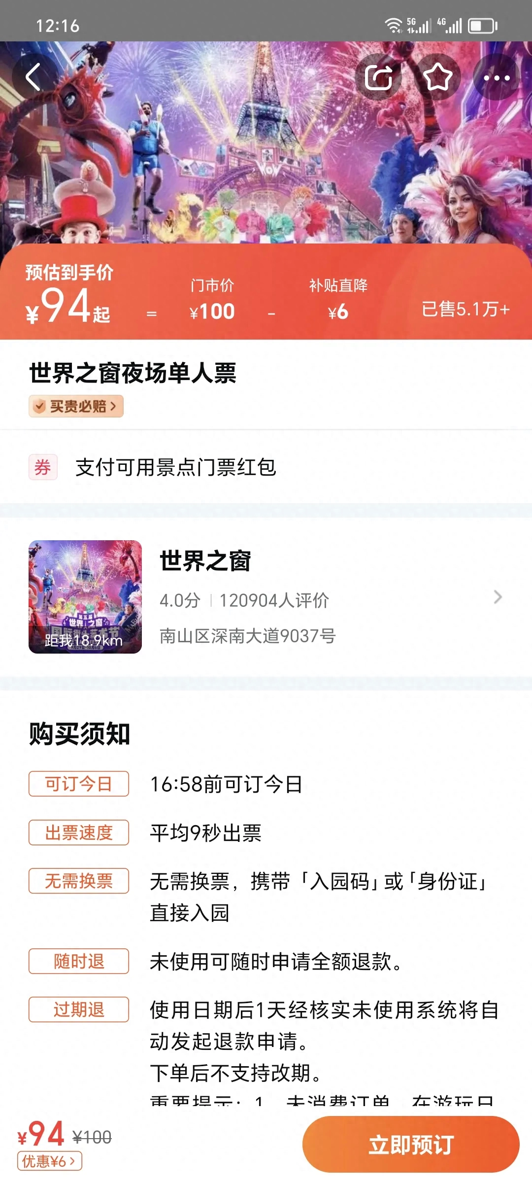 深圳世界之窗游玩攻略,提前一天在网上购买夜场门票。(个人推荐夜场门票合算,不晒不热,而且能看到烟花和灯光秀,游乐设施一样可以玩!)