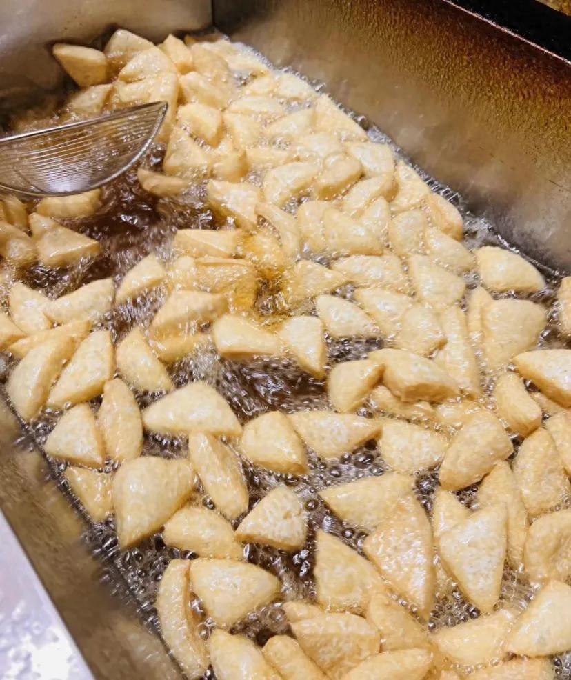 ?另外还有一个大三角包心豆腐干的炸制,类似肉夹馍的那种形式,炸好之后里面是可以放土豆泥、萝卜丝、海带丝、鸡柳之类的小吃,基本就是这些东西。
