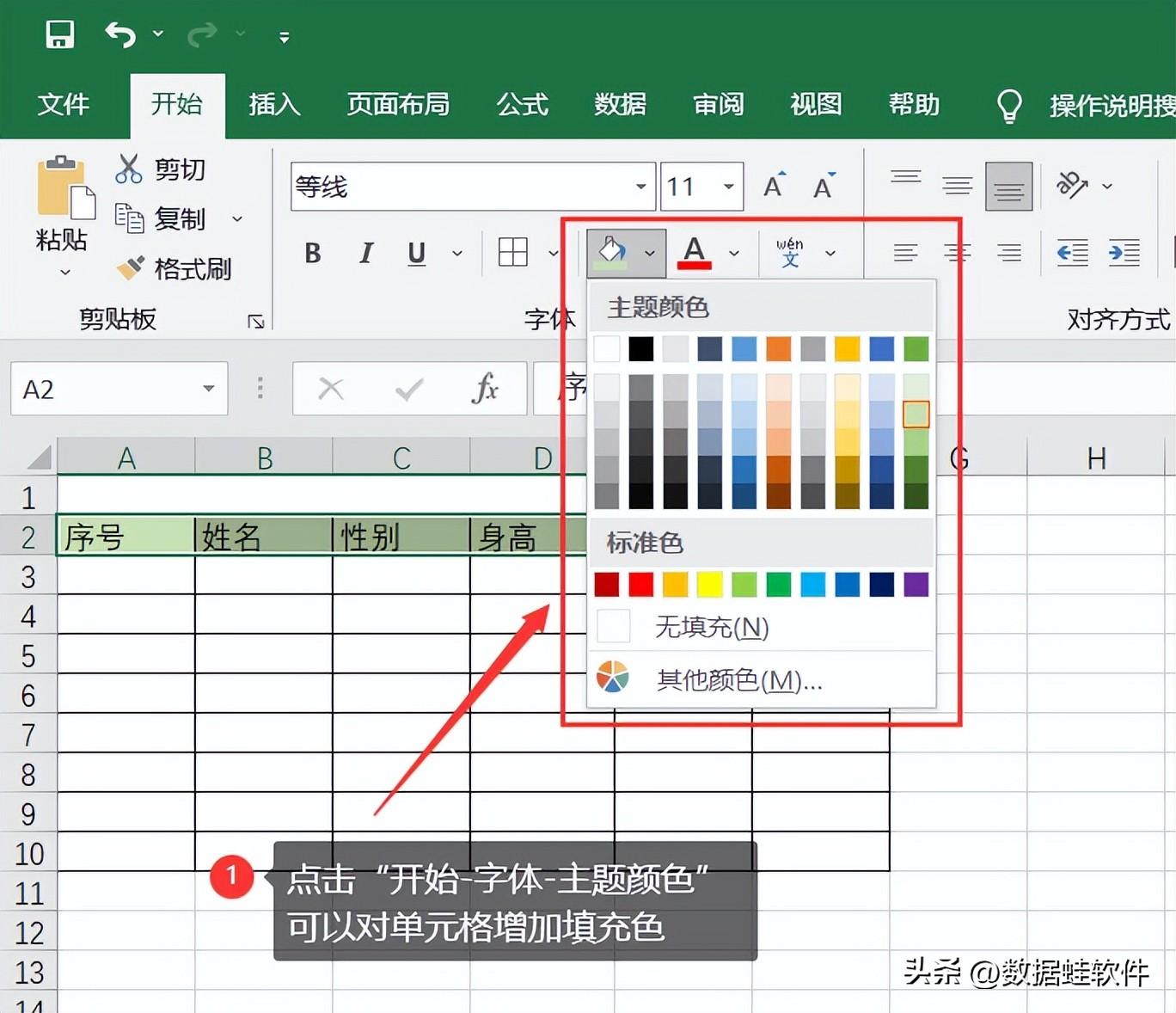 选中单元格,在【开始】菜单栏目内,找到并点击【字体】里面的【主题颜色】。里面有多个颜色可供选择,选择浅色打底即可。