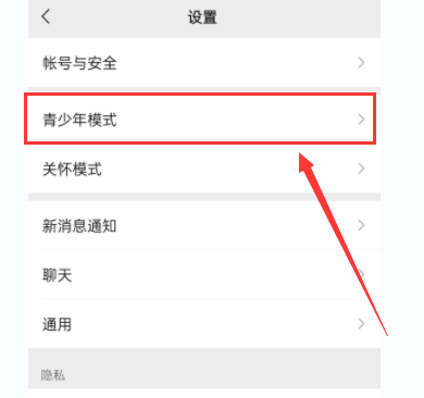 然后在设置界面中选择青少年模式,我们点击进入;