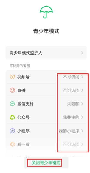 这里就以微信为例,来说说微信的青少年模式是怎么打开和关闭以及权限设置的。