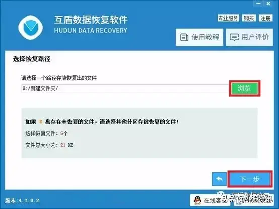 5、会弹出选择恢复路径的窗口,点击“浏览”按钮,自定义选择好恢复路径后,注意所选的磁盘不能与被恢复的磁盘重合,随后点击“下一步”按钮即可,就恢复了手机中被误清空的文件了。