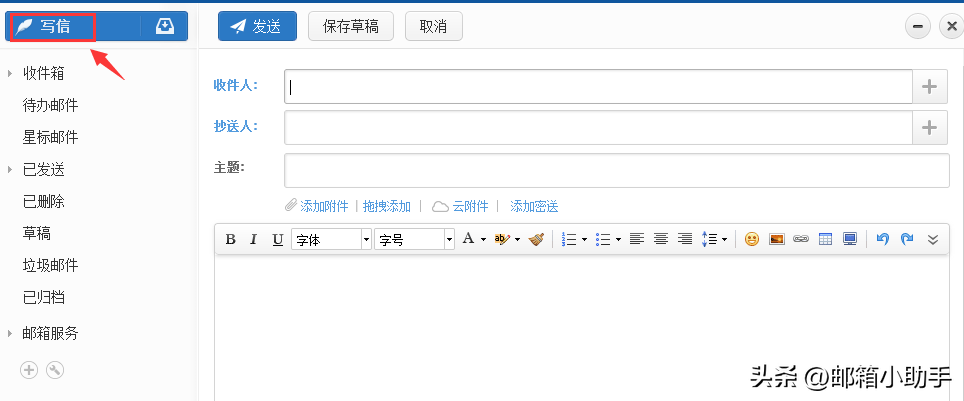 点击邮箱左侧的“写信”按钮,则会打开写邮件页面(如下图所示);