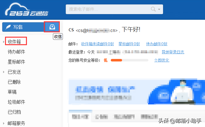 点击邮箱界面左侧的“收信”按钮或左侧导航区域的“收件箱”选项,打开收件箱页面,即可看到收件箱中的所有邮件列表(如下图所示);