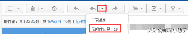 ?带附件回复全部:选择一封邮件,选择“回复全部”选项下的“带附件回复全部”按钮,可以将原邮件的附件添加至新的邮件中进行回复(如下图所示);