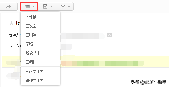 选择一封或者多封邮件,点击工具栏中的“移动到”按钮,弹出菜单中,选择所要移动到的文件夹,则将已选择的邮件移动到所选文件夹中(如下图所示);