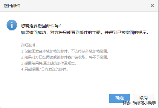点击“撤回”,会弹出如下窗口,点击“确定”,即可撤回满足相关条件的邮件: