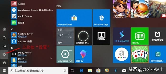 一、依然是从桌面开始 从桌面左下角点击“WINDOWS”键,然后选择上面的“设置”选项,如下图: