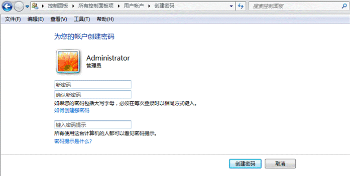 三、进入管理员密码创建,选择创建密码即可开始为电脑设置密码了,进入密码设置,在输入一个新密码的地方输入你想要的密码,下面一个再次输入相同的密码进行确认。最后一个让我们为自己的密码设置一个提示语句,防止我们自己也忘记密码进入不了电脑。所以建议大家在密码提示里输入密码提示比较好,当然也可以不写。将以上密码资料填写完毕之后,点下最底部的最后一步:点击创建密码。即可完成开机密码设置了。