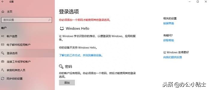 三、看到的帐户设置界面之后,在左侧选择“登录选项”,然后在右边的“登录选项”中选择“密码”选项的添加,即可进入密码设置界面